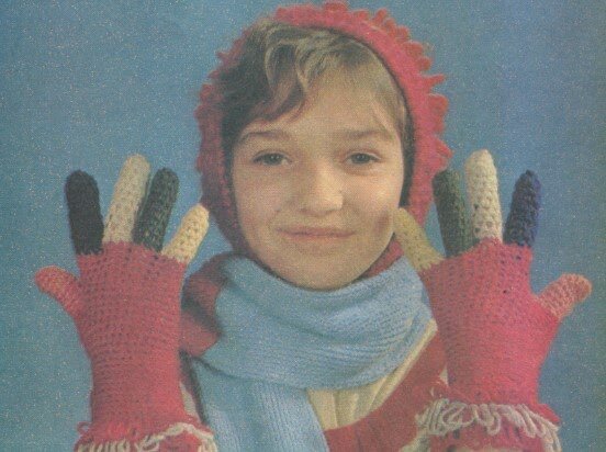 Добрый день, читатели. Давайте свяжем перчатки с разноцветными пальцами. Они тоже вяжутся из остатков пряжи. Если в предыдущей статье перчатки вязались вдоль руки, то этот способ — вязание поперек, то есть по окружности. Пример вязания даю на ребенка 5-6 лет. Делаем цепочку из 42 воздушных петель и замыкаем ее в круг. Начинаем вязание с манжеты. Вяжем ее поперечной резинкой из столбиков без накида за стержень столбика предыдущего ряда. Приблизительная высота 6 см. А вы замеряете по своей руке или руке того, кому вяжете перчатки. Далее следует подъем до начала большого пальца и равен он 4-м см, состоит из столбиков под цепочку предыдущего ряда. Оставляем 10 петель для большого пальца и вяжем еще приблизительно около 3 см ладонь до основания пальцев. Делим полученный круг на четыре части, берем нитки разного цвета и вяжем пальцы по кругу также столбиками без накида. Длина пальцев по вашим замерам. На последнем круге вяжем по два столбика вместе и закрепляем остаток нити на изнаночную