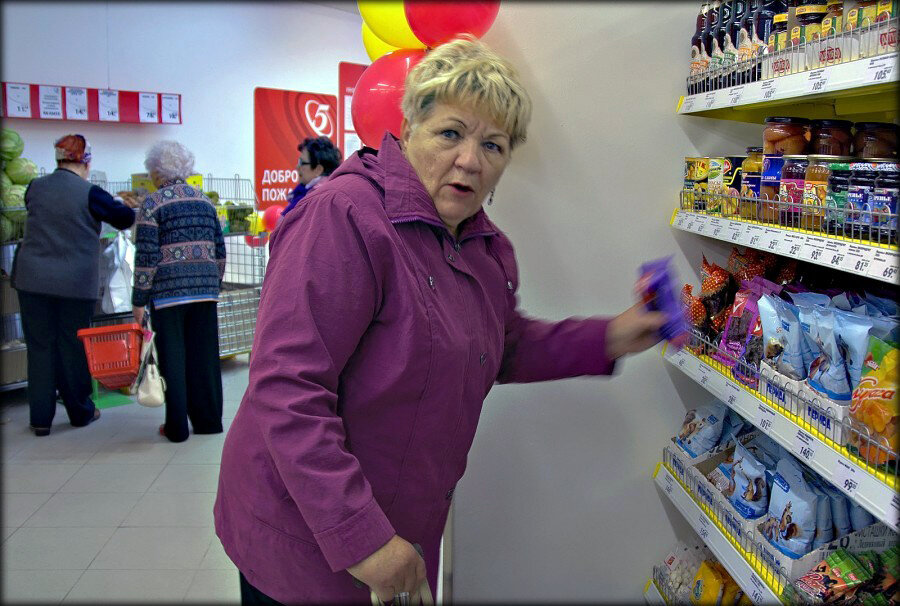 Бабулька рассовала по карманам, по сумкам товара на 700 рублей. На кассе пробила только хлеб и молоко. Про видневшийся товар из других сумок заявила, что это - из других магазинов. На просьбу кассира предъявит чеки, сказала, что "бумажки не собирает. И вообще, что привязались к старому честному человеку?" Когда ей показали видео, где она В ЭТОМ МАГАЗИНЕ берет товар, стала утверждать, что видео - подделка, ее кто-то хочет оболгать. И что "в этот паршивый магазин со злыми продавцами больше ходить не будет". Когда ей сказали, что вызовут милицию - разобраться: кто лжет, а кто ворует, быстро оплатила весь товар и так же быстро ушла. Я все не понимала - почему она так сделала. Ведь нашлись у нее деньги для оплаты. Объяснение пришло на следующий день. Другая бабулька спросила - где найти мыло. Прошла в отдел с большой сумкой. На кассе сумку чуть-чуть приоткрыла: "Ничего не взяла". А мне в монитор было видно, что она туда что-то кладет. Попросила открыт сумку пошире, чтоб заглянуть внутр. Баб
