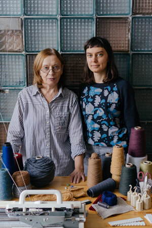 Мама и дочь Трофимовы. Татьяна Николаевна вяжет и укрощает ручную вязальную машину, Елена придумывает дизайны, рисует принты, подбирает цвета и отвечает за всю организацию.