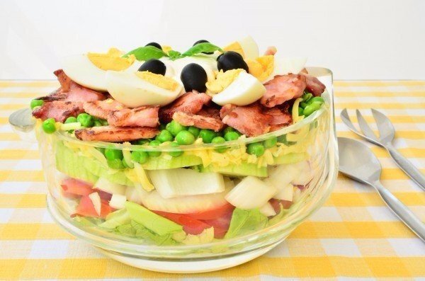 Ингредиенты: Приготовление: 1. Яйца отварить вкрутую, остудить, почистить и разрезать на четыре части. 2. Бекон порезать и поджарить на сухой сковороде до золотистого цвета. 3. Зеленый горошек отварить до мягкости. 4. Помидоры и огурцы помыть. Нарезать томаты дольками, огурцы — кружочками. 5. Зелень салата порвать руками, белую часть лука-порея порезать кольцами. 6. Сыр натереть на терке. 7. На дно салата выложить латук, затем помидоры, лук-порей, огурцы, тертый сыр, зеленый горошек и бекон. 8. Украсить кусочками яиц, оливками и полить майонезом. Перед подачей салат охладить. Перемешивать и приправлять его нужно уже после подачи. Приятного аппетита! Готовьте с душой! Подписывайтесь на канал, ставьте лайки и пишите в комментариях свои впечатления. Читайте так же Лионский салат! КРАСНЫЙ БАРХАТ! Киш с курицей и брокколи! Вкуснейший лагман! Куриный рулет! НУДЛИ ПО-УКРАИНСКИ! Мясо по-купечески с грибами! Шампиньоны по-корейски! Макаруны! Фаршированные окорочка сыром Классичес