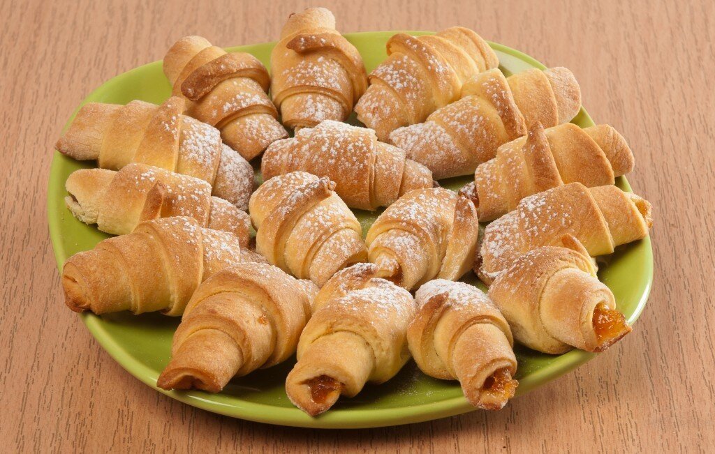 Для смазывания: Дрожжи развожу в молоке с солью и сахаром. Далее добавляю яйцо, растительное и мягкое сливочное масло, пюре и частями муку. Замешиваю тесто, накрываю полотенцем и оставляю на час. Делю на 4 части, раскатываю в круг и нарезаю на восемь треугольников. К широкому краю выкладываю 1 ч.л. любого джема и сворачиваю рулетиками. Выкладываю на застеленный пергаментом противень, накрываю салфеткой и оставляю на 30 мин. Смазываю желтком, смешанным с молоком, и посыпаю кунжутом. Выпекаю при 180-200 град, до готовности. ПРИЯТНОГО АППЕТИТА!