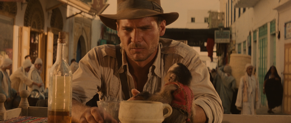 Согласно сценарию, Индиана Джонс (Харрисон Форд) должен был использовать кнут, чтобы обезоружить нападавшего. Однако в тот день актер страдал от пищевого отравления и после нескольких неудачных попыток предложил режиссеру просто застрелить противника. Идея была од