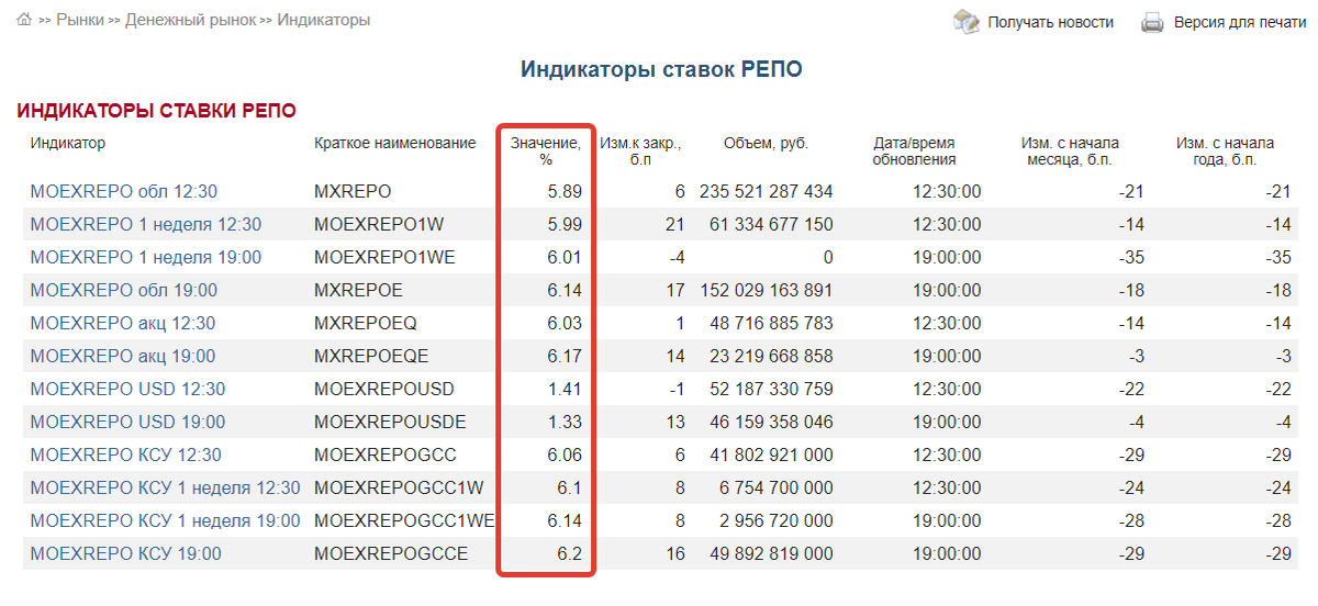 На сайте Московской бирже есть вся информация по ставкам РЕПО. Данные меняются постоянно, поэтому числа на картинке ниже не актуальные. Лучше перейти по ссылке. И воочию узреть текущие ставки.