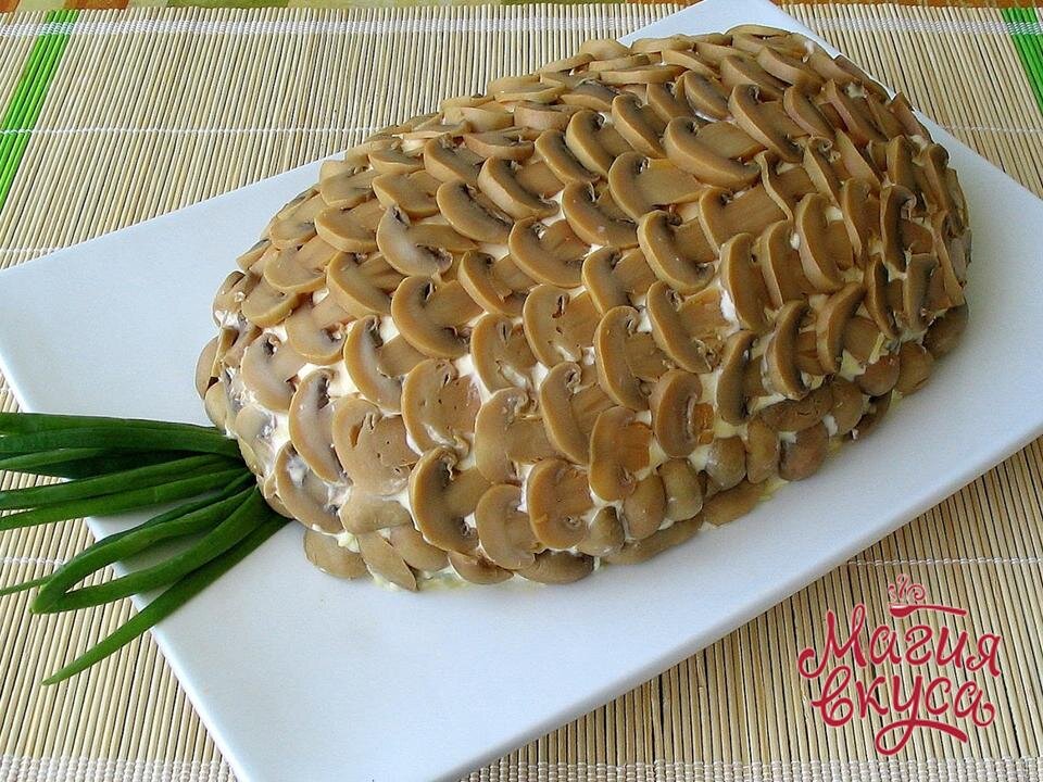 Такой салат мы делали на юбилей отцу. Он стал настоящим шедевром праздничного стола, и гости по достоинству оценили его вкус и оригинальность. Салат «Ананас» с грибами получается очень вкусным, особенно нравится тем, кто не любит орехи в салате. Хочу поделиться с вами этим рецептом. Попробуйте, думаю, вы тоже оцените это блюдо по достоинству! Для приготовления салата нам понадобится: Начинаем готовить. Свежие шампиньоны, моем, чистим и нарезаем небольшими кусочками. Обжариваем на разогретой сковороде с растительным маслом, солим по вкусу. Морковь моем, чистим, натираем на крупной терке, и тоже обжариваем на сковороде с растительным маслом отдельно от грибов. Ветчину нарезаем соломкой. Куриные яйца варим вкрутую, остужаем в холодной воде, и натираем на крупной терке. Сыр натираем на мелкой терке. На блюдо выкладываем слоями салат в виде овала, слегка смазывая каждый слой майонезом. 1 слой – грибы обжаренные 2 слой – морковь 3 слой – ветчина 4 слой – яйца 5 слой – сыр Весь салат смазывае