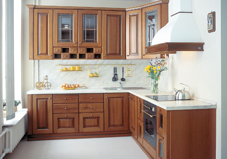 Самая популярная кухня – безусловно, угловая. Угловая планировка кухни годится для любых помещений — больших и маленьких, открытых и изолированных. В некоторых кухнях именно Г-образный гарнитур позволяет выкроить место для обеденного стола. Да и с точки зрения эргономики, угловая кухня демонстрирует самое правильное соотношение сторон у рабочего треугольника (плита-мойка-холодильник). Как функционально обыграть угол гарнитура? Самое распространенное решение, которое имеет угловая кухня, – это размещение мойки в углу. Однако тогда использовать площадь в угловом шкафу полностью не выйдет – сифон и трубы «съедят» пространство. На самом деле, мойку лучше всего располагать подальше от угла. А незадействованный угол столешницы можно приспособить для хранения мелкой бытовой техники: кухонного комбайна, тостера, микроволновки. Угловой шкаф бывает трех типов: прямо угловой шкаф, трапециевидный угловой шкаф или Г-образный угловой шкаф. Первый состоит из прямой столешницы и корпуса стола, передня
