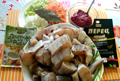 Вариантов приготовления популярной и не дорогой рыбы минтай, очень много. Минтай жарят, пекут пироги, делают котлеты и тефтели. Я предлагаю приготовить минтай тушеный с овощами в томатном соусе. Конечно, можно потушить минтай и на сковороде, но быстрее и вкуснее, с более насыщенным и нежным вкусом приготовить в мультиварке. По желанию рыбу можно предварительно обжарить на масле, получится, конечно вкуснее, но можно и заложить в мультиварку сырую рыбу, так по моему мнению, будет менее калорийно. Нам понадобится: Рыбу очистить от мелкой чешуи, вынуть внутренности, убрать черную пленку и отрезать плавники и хвост. Нарезать на порционные куски.