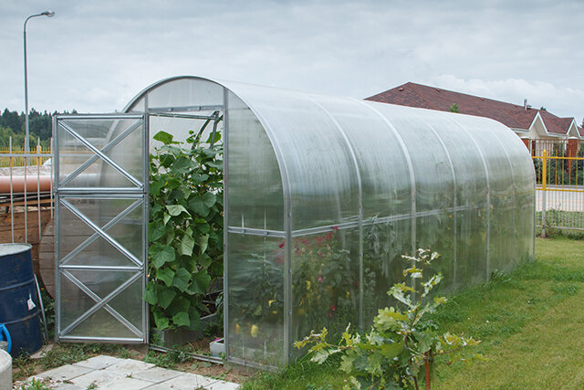 Во многом длина теплицы зависит от количества высаживаемых культур и размеров участка.Единственная проблема, которая раньше возникала в стеклянных длинных теплицах – неудобный уход за растениями, когда за каждым ведром приходилось возвращаться в начало. Сейчас эта в поликарбонатных теплицах на металлическом каркасе эта проблема легко решается: двумя дверьми в торце, боковыми окнами, съемными или сдвижными боковыми панелями.