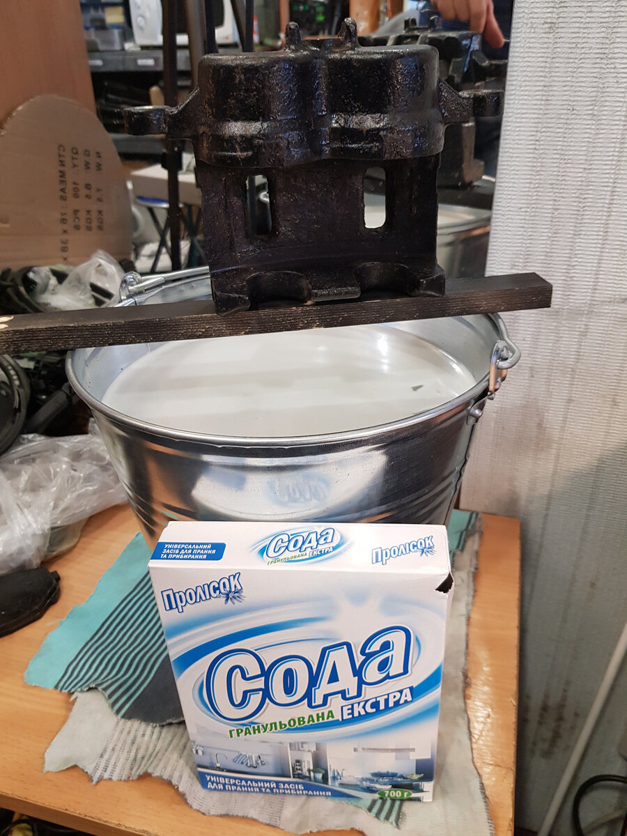 Всем привет, понадобилось очистить уставший суппорт от авто не обрабатывая механически внутри стенок цылиндров суппорта, так как там была корозия,пескоструя у меня нет и он не желателен внутри полости рабочей, где стоят манжеты и ходит поршень, так как пескоструй делает микропоры от ударов песка. Был выбран метод электролиза. Новое ведро оцынкавку купил и пачку кальцинированной соды бытовой. Можно и пищевую, но она слабее, можно гранулы для прочистки засоров в трубах, но она ядовитый газ выделяет сильно, хотя и ржу отьедает хорошо. Блок питания можно использовать любой, в пределах 12-20 вольт постоянка нужна и ток чем больше-тем быстрее будет очистка, у меня был слабенький 15в и 6ампер, потому шло все не сильно быстро, через 5 часов после погрузки металла в ведро с водой и содой(соды 2 одноразовых стакана на 10 литров и размешать) процес еще не закончился и я оставил на сутки, в итоге через сутки ржу всю отлично отьело, но и ведро проело до дырок)) Подключение к ведру + от БП, к металл