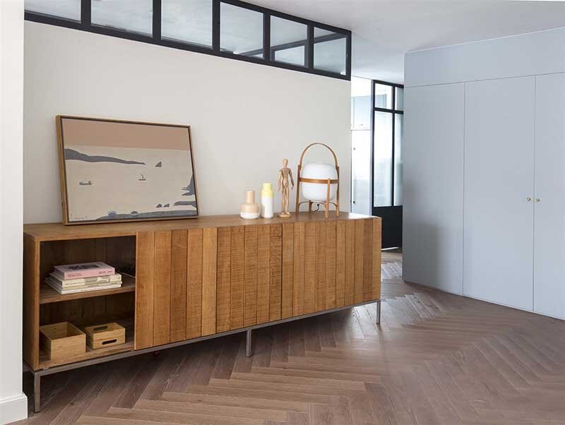 Дом площадью 250 кв. м с видом на Парк Туро (Turó Parc) в Барселоне был реформирован дизайнером интерьера Барбарой Аурелл и её студией Espacio en Blanco по заказу молодой семьи. Центральное пространство и «ось» дома – огромная гостиная, которая тесно связана со столовой и кухней. Главные герои этой части дома – диван, книжный шкаф, изготовленный на заказ, и оригинальный сохранённый камин 70-х гг. Кухню от гостиной отделяют раздвижные двери из чёрного металла и стекла с эффектом трещин. В зависимости от ситуации зоны можно объединять. Ключевая идея проекта – создать оживлённое открытое пространство, полное света и цвета. Здесь дизайн, искусство и хроматические решения формируют идеальное пространство. Линейная функциональная структура дома подчёркивается металлоконструкциями. Харизму и индивидуальность дому придаёт натуральный паркет медовых тонов, используемый практически во всех помещениях. Главную роль в интерьере играют зоны хранения – все шкафы изготовлены на заказ, колористическ