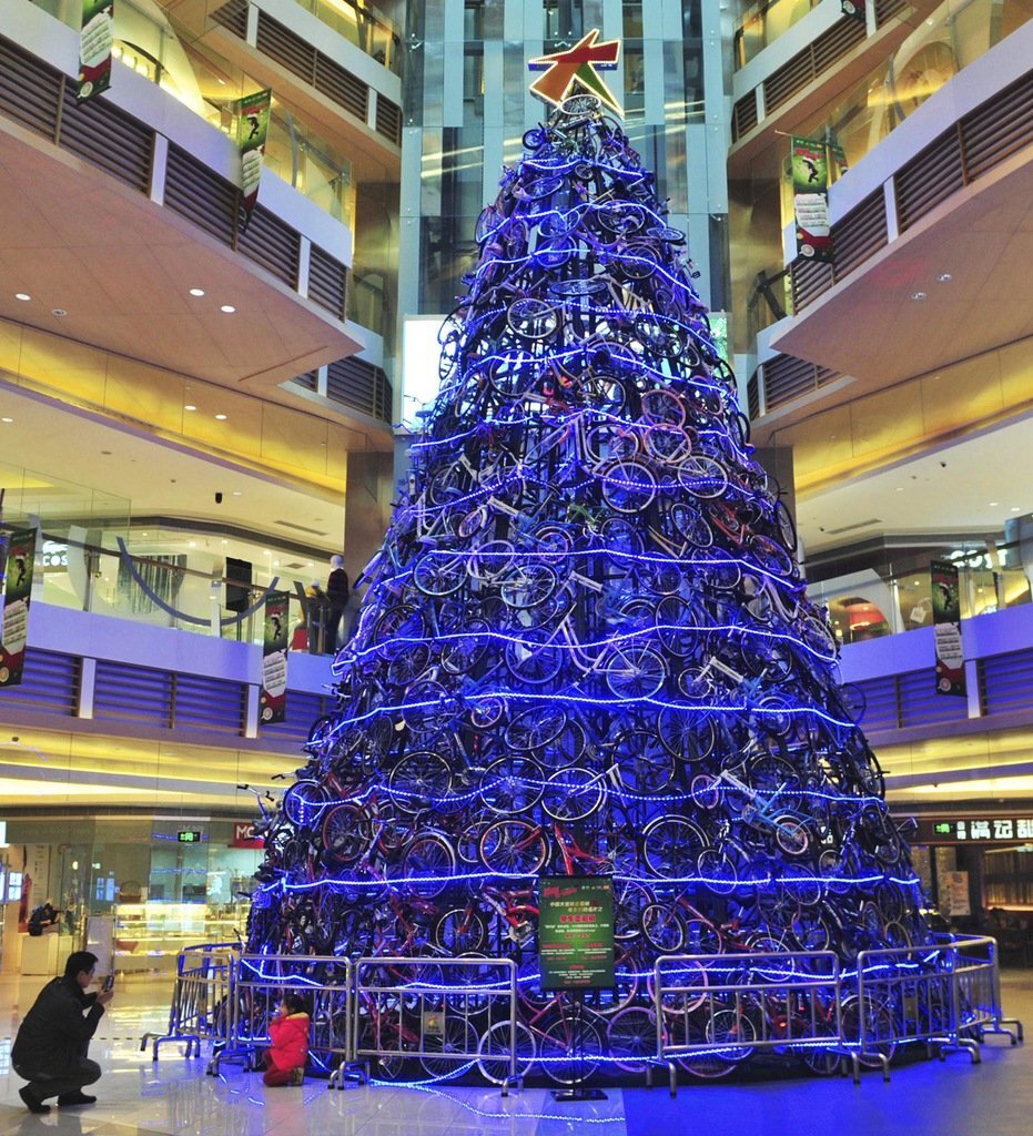 Ёлка из велосипедов Самой необычной ёлкой можно по праву считать ёлку из велосипедов. Во многих городах разных стран устанавливали такие ёлки. Но переплюнули всех китайцы, которые возвели конструкцию из 230 велосипедов высотой 12 метров. Велосипеды были раскрашены в разные цвета, чтобы напоминать ёлочные украшения. На постройку этого сооружения у создателей ушло почти два месяца. Такая ёлка стала украшением торгового центра города Шеньян. Вокруг нее обмотали гирлянду с 10 тысячами фонариков, а на верхушку установили эмблему торгового центра. Ель получила название «Рождественское дерево на колесах». Ёлка из бананов Если ёлки нет, но очень хочется, тогда можно смастерить ее из фруктов. В ливанском городе Дамур выросла восьмиметровая ёлка из пяти тысяч бананов весом более тонны. Когда бананы созреют, администрация города раздаст бананы всем желающим. Самая большая ёлка на воде Если надоело водить хороводы вокруг ёлки, то можно вокруг нее поплавать. Самая большая плавучая елка, занесенн
