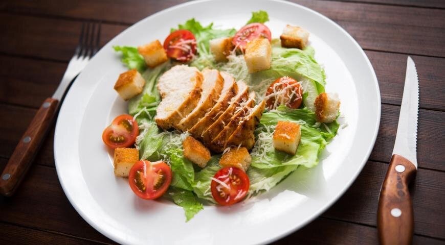 Маҳсулоти лозима: Гӯштимурғ — 200 грамм, Барги салат — 1 бандча, Помидори хурд — 4-5 дона, Панирисахт — 75 гр, Хлеби сафед — 3-4 пора, Сирпиёз — 3 дандона, Равғанизайтун— 3 қошуқ, Намак, мурч— мувофиқи табъ, Тухм— 2 дона, Ҳардал— 1 қошуқ, Шарбатилимӯ— 2-3 қошуқ. Тарзи таҳия: Тамоми маҳсулоти даркориро омода созед. Тухмро дар оби ҷушон муддати 3-5дақиқа нигоҳ доред. Тухмро аз даруни оби ҷушгирифта, дар пиёлае шиканед ва ба он шарбати лимӯ, панири аз турбтароши сурохиҳояш хурд гузаронидашуда, ҳардал, 1 дандона сирпиёзи куфташуда омехта созед. Маҳлули тайёр шударо тавассути блендер лат занед. Хлеби сафедро ба пораҳои начандон калон реза карда, дар лаълии тафдон тунук кунеду аз болояш камее маҳлули аз равғани зайтун ва тухм омодашударо рехта, дар ҳарорати 180 дараҷаи тафдон 2дақиқа нигоҳ доред. Пораҳои хлеб бояд каме зардчатоб шавад. Гӯшти мурғро ба пораҳои ғафсияш 10-12 мм реза кунед. Гӯшти резашудаи мурғро дар оташи паст, дар равғани зайтун то пухтанаш бирён кунед. Чанд