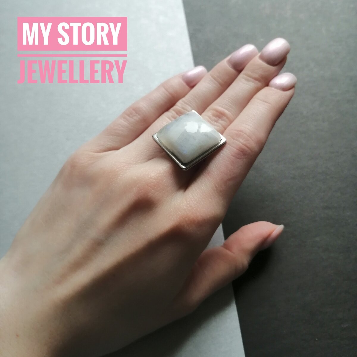 На фото кольцо с Лунным камнем, крупный натуральный Адуляр с синей ирризацией, фурнитура из нержавеющей стали с регулируемым размером.