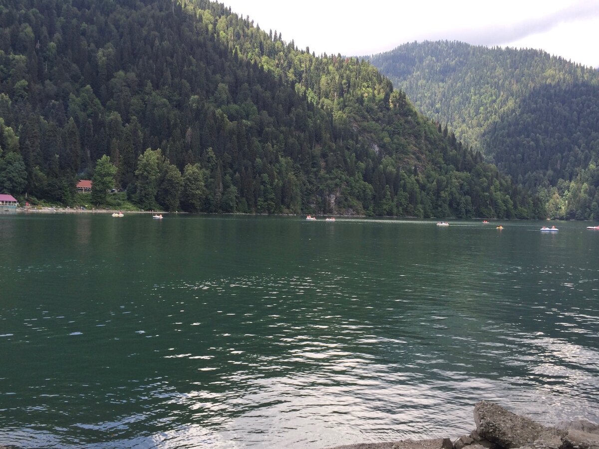 От побережья Черного моря по навигатору мы проехали по автомобильной дороге к озеру Рица, проходящая по долинам рек в горы в заповедной зоне. Серпантин узкий, местами дорога плохая. Ехали примерно 1,5-2 часа. Находится оно на высоте 950 м газ уровнем моря, а горы имеют высоту примерно 2200-3000 м! Вид на озеро просто завораживает! Фотографии не передают той красоты, которая там нас окружает! Озеро Рица окружено горами, на вершинах которых лежит снег. Не все вершины видны - их скрывают облака. И всё это отражается в чистой зелено- желтой воде. Стоит посмотреть на уникальную достопримечательность своими глазами. На берегу озера, как и везде, есть кафе с национальной кухней, где мы и перекусили. Можно даже прокатиться по озеру на катамаране и порыбачить. А вот купаться не разрешают, так как вода там холодная. Там же на берегу озеро находится дача Сталина, которую можно посетить заплатив за вход.