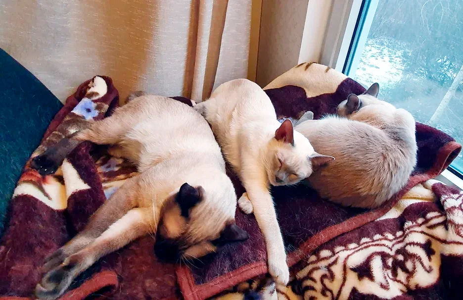 Наша сегодняшняя тройная кошачья идиллия, а именно первый раз, когда коты спали втроем, закончилась неожиданно и внезапно 🙀