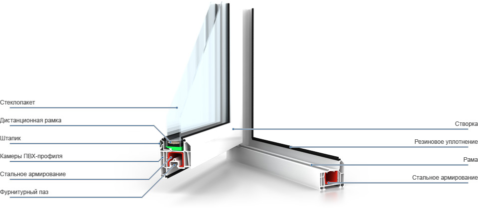 Устройство пластикового окна – это многокомпонентная сложная конструкция, которая у каждого производителя отличается. Двухкамерные, трехкамерные, пятикамерные – каждый вид стеклопакета имеет свое строение и характеристики сохранения тепла, звукоизоляции, защиты от сырости и ветра. Давайте разберемся, как устроено окно ПВХ в разрезе. Из чего состоит пластиковое окно: основные элементы Стеклопакет Та часть окна, через которую мы и смотрим из помещения наружу, т.е. стекла. Это довольно важная и сложная, характеризующая герметичностью конструкция. Между элементами стеклопакета находится осушенный воздух, благодаря которому и создается своеобразный заслон на пути тепла, стремящегося покинуть помещение через окно.