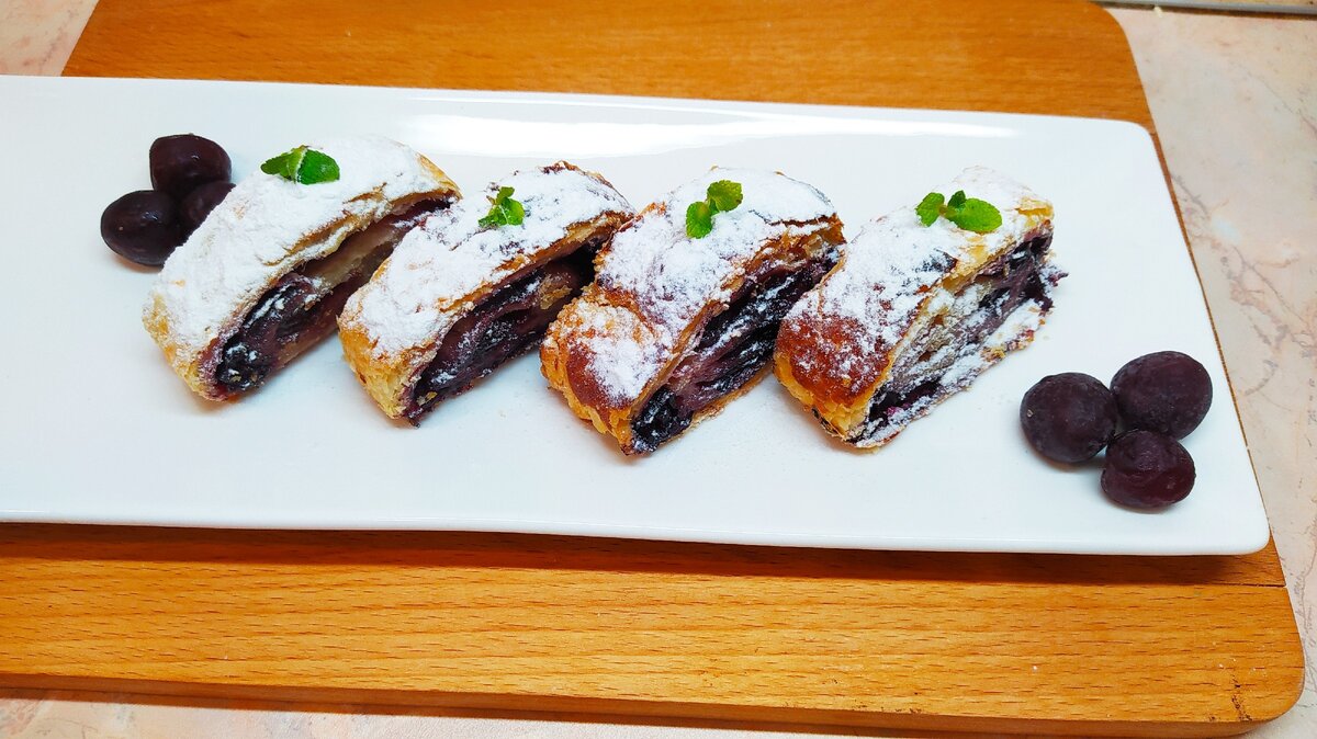 Раскатываю тесто прямоугольной формой и хаотично раскладываю по всей поверхности вишню.