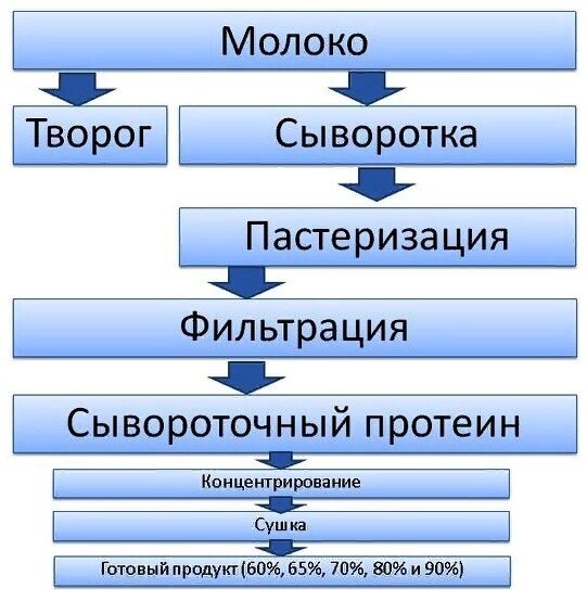 WHEY — молочная сыворотка на английском. Дабы долго не нудеть про всякие технические нюансы и разновидности, вот вам простая и понятная схема «добычи» сухого порошка из мокрой сыворотки: