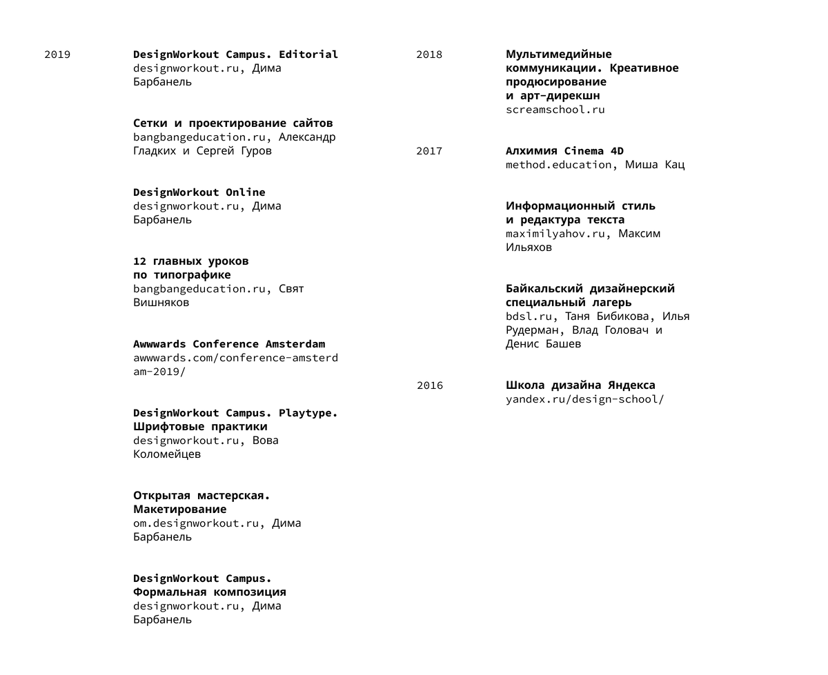 campus.designworkout.ru/playtype Курс тоже проходит в кампусе Барбанеля, но ведет его Вова — не менее крутой и харизматичный человек. Заданий меньше, но они объемнее. Если «Основы композиции» можно сравнить с Iron Man, то курс Вовы по медитативности больше похож на Tour de France. Длится пять дней. На выходе у каждого будет два (!) собственных шрифта и плюс еще целый зин