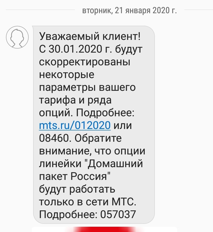 Уважаемый клиент! С 30.01.2020 г. будут скорректированы некоторые параметры вашего тарифа и ряда опций. Подробнее: mts.ru/012020 или 08460. Обратите внимание, что опции линейки "Домашний пакет Россия" будут работать только в сети МТС. Подробнее: 057037.