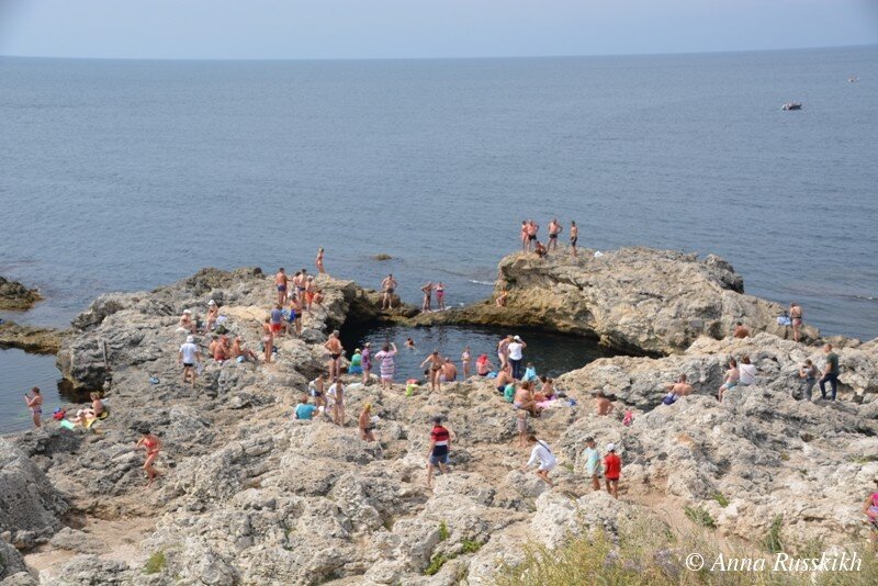 Еще только планируя поездку в Крым и рассматривая картинки в интернете, Ульяшка наткнулась на фотографию природного бассейна в окружении скал с водой бирюзового цвета. "Мама, давай обязательно съездим сюда. Посмотри, как красиво" - сказал ребенок. И вот мы около живописная, полностью замкнутой каменной чаши.