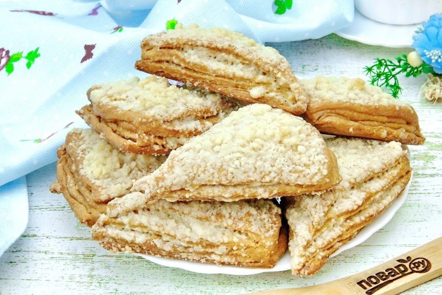 Всем привет сегодня готовим слойки на кефире наполеон нереально вкусные но действительно чем-то похоже на отдаленно наполеон такие как будто они даже творожный хотя здесь просто кефир начинаем готовить легко и просто и вы будете готовить точно две нормы готовится все легко и просто и так взвешенную муку отправляем в небольшую емкость чтобы удобнее было формировать тесто значит масло я беру прям с холодильника холодная вот так вот обмакиваю в муку и натираю натерли значит не спешите мыть терку она еще нам вот в таком виде понадобится отставляем ее сюда прямо вот так вот в масло и муку рассыпаем разрыхлитель я добавляю немного соли вот так где то 2 3 щепотки теперь все хорошо перемешиваем и делаем из масла и муки крошку придавливаем уже все руками чтобы у нас получилась однородная такая крошка масляная сюда же отправляем 250 миллилитров кефира два и пять процентов у меня и теперь замешиваем тесто масляная вот это на кефире по факту это песочное тесто приготовленное на кефире очень вкусная все вместе соединяем в большой комочек у нас получается тесто тесто вымешивать не надо вот так вот собрали и берем пакет или пищевую пленку перекладываем тесто пищевую плёнку и убираем в холод на чашку теперь приготовим вторую половину теста и она будет сладкой значит тоже муку но сюда же добавляем сахар сразу и я добавлю ванильку люблю свой некой так теперь что я делаю беру тоже холодный кусок масла с подельником все перемешиваю и вот так вот натираю тоже распределяем масло равномерно вот так вот и перетираем руками чтобы у меня получилась масляная крошка когда добавляете ванильку так пахнет все ванилин так пахнет я обожаю запах ванили очень круто смотреть когда я перетираю я делаю вот так набираю вот так вот вот это масло с мукой и сахаром и вот так вот один об одну обтираю получается мелкая и крупная крошка значит смотрите все должно иметь состоянии крошки пока масло ещё была холодная а но так сказать не надо не надо его сдавливать чтобы все это превратилось в масляное тесто ни в коем случае теперь вот в таком виде убираем в холодильник в холод чтобы она все так и осталось крошкой тесто полежало у меня холодильнике где-то часа полтора два часа абсолютно достаточно меньше не стоит теперь его нужно вот так хорошо обмять она холодная но у не успела слишком затвердеть если прилипает тесто сильно можно посыпать стол мукой тесто делим пополам и каждую часть я делю на три части так но приблизительно вот так итак стол застелили мукой застелили присыпали и раскатываем каждый кусочек раскатываем в прямоугольник донка я делаю по нескольку миллиметров сейчас покажу как пока вы все раскатываете пусть духовка разогревается на 180 градусов теперь начнет смотрите приблизительно вот такие прямоугольники у меня получаются они очень тонкие приблизительно от трех до пяти миллиметров видите вот такой тоненькой-тоненькой тесто теперь достала я масляную крошку из холодильника оно замерзло я еще раз ее разом ну вот так чтобы большие кусочки стали более мелкими всю крошку зрительно разделить на пять частей вот так вот я на глазок разделяю смотрите теперь беру одну часть и отправляю на 1 корж вот так вот посыпаю это довольно старый рецепт можно делать кругом можно делать прямоугольной формой как хотите можно вообще даже не нарезать мы сегодня будем нарезат