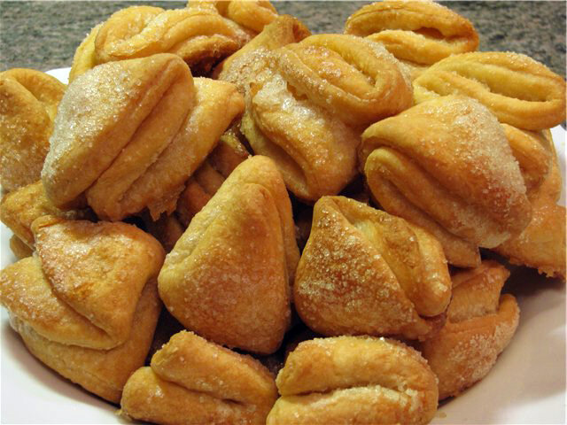 Творожное печенье гусиные лапки Предупреждаю сразу: печенье это крайне невыгодное, лучше не пробуйте, а то не сможете потом оторваться. Оно настолько нежное, пушистое, и во рту тающее, что заканчивается, толком не успев начаться. Ингредиенты: 200 г творога; 200 г сливочного масла; 2 яйца, Щепотка соли, 1 чайная ложка разрыхлителя, Щепотка ванилина; 2,5-3 стакана муки; сахар для присыпки. В тесто сахар не кладём. Приготовление: 1. Тесто готовится совсем быстро, во всяком случае, технический прогресс этому способствует. Закидываю в блендер творог, соль и яйца и взбиваю 2. Добавляю мягкое масло, еще раз быстренько взбиваю. Полученную творожно-масляную кашицу выкладываю в смесь муки и разрыхлителя. Вымешиваю тесто. Муки требуется, примерно, стакана три, может меньше, всё зависит от размера яиц и влажности творога. Поэтому я никогда не выкладываю всю муку в тесто сразу, а подсыпаю по чуть-чуть. Тесто вымешивается легко и быстро. 3. По правилам тесто надо выдержать в холодильнике часа пол