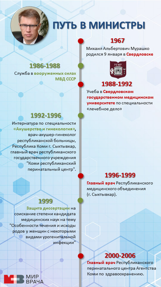 21 января 2020 года президент РФ Владимир Путин назначил министром здравоохранения РФ Михаила Мурашко, который ранее возглавлял Росздравнадзор. На посту главы министерства Михаил Мурашко сменил Веронику Скворцову. Интересно проследить путь нового министра здравоохранения к должности. Портал МирВрача представил эту информацию в виде инфографики. Еще больше материалов для врачей доступно на mirVracha.ru! 💡 А также по теме: Тюрьма за ошибку (новости) Вместе двигаемся в фарватере НМП Президент послал на работу в выходные