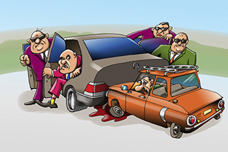 600-й останавливается на повороте горной дороги. Из-за угла вылетает Запорожец и со всей дури, не успев затормозить, врезается в бок 600-го. Мерин кувыркнулся с обрыва и взорвался.