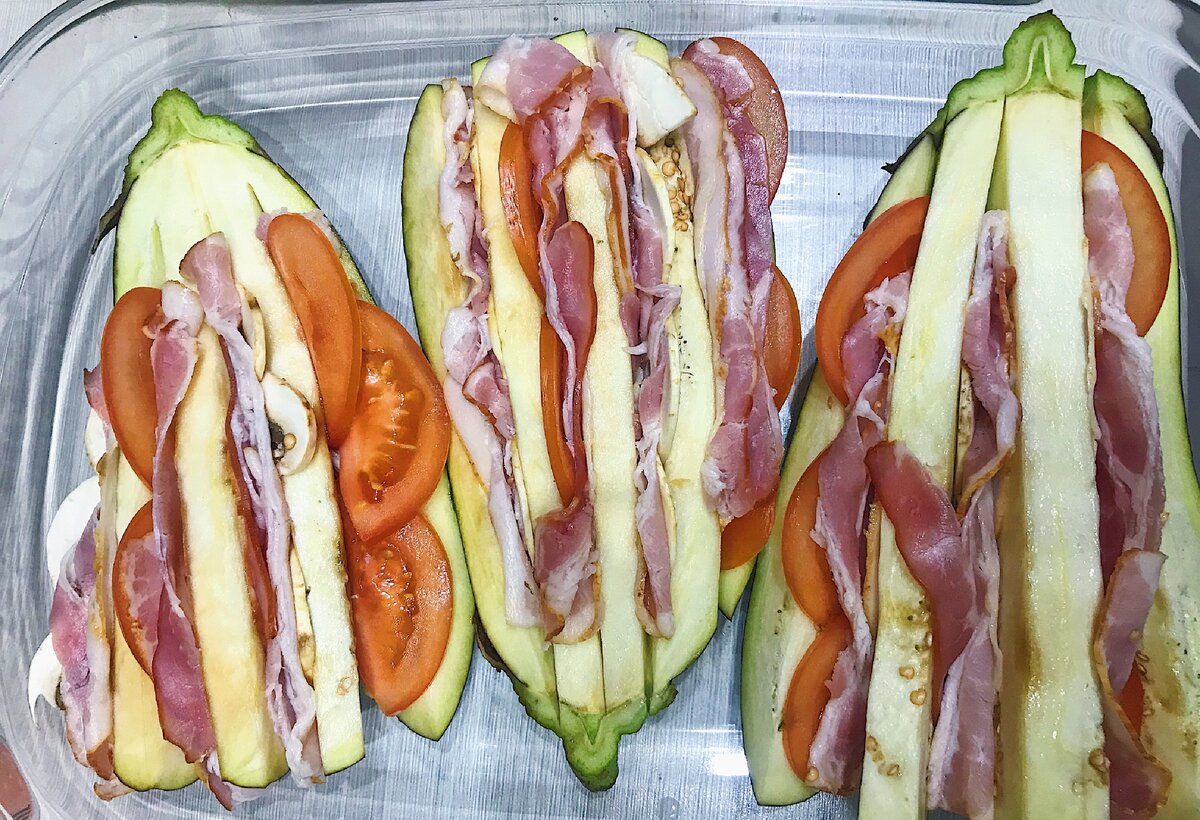 Баклажаны запечённые с сыром, беконом и грибами. Фантазировать с начинкой можно, как угодно. В разрезы баклажана можно добавлять абсолютно все, что имеется в холодильнике: помидоры, любые сыры, колбасу, ветчину, бекон, картофель, шампиньоны и т.д. Готовится блюдо довольно легко и быстро, поэтому идеальный вариант для ужина на скорую руку. Из двух баклажанов получается 4 порции. Нам понадобится: Подготавливаем овощи, хвостик баклажана не отрезаем, чтобы наш баклажан не развалился. Помидор, шампиньоны и часть сыра режем на слайсы не слишком тонко, но и не переборщить по толщине. Оставшуюся часть сыра натереть на мелкой терке. Баклажан разрезаем на две половинки и каждую половинку надрезаем вдоль на несколько ломтиков, не дорезаем до конца, оставляем ломтики висеть на хвостике баклажана. Можно сделать надрезы не насквозь, а оставить лодочкой, чтобы баклажан не разваливался. Посыпаем баклажан гранулированным чесноком в разрезах и сверху, солим по вкусу. Помещаем баклажаны в форму для