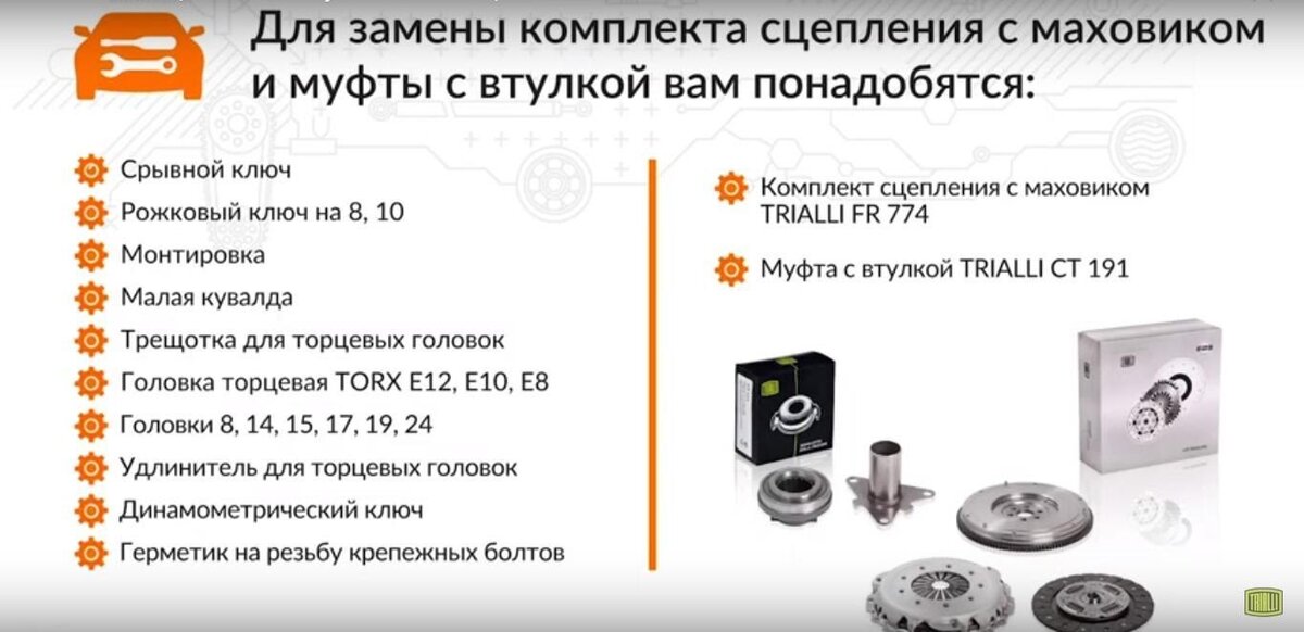 В данной статье мы рассмотрим установку комплекта сцепления TRIALLI FR 774 с диаметром 215 мм, которое предназначено для автомобилей Lada Vesta и X-Ray, на автомобиль Lada Kalina II с двигателем 1.8.