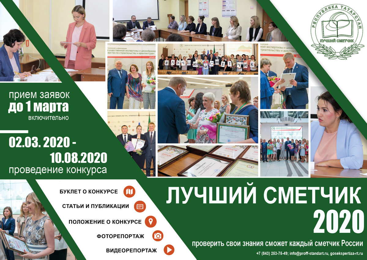 Принимаются заявки на участие в конкурсе «Лучший сметчик 2020 года» О конкурсе: Конкурс проводится с 2014 года с целью повышения эффективности деятельности специалистов в области ценообразования и сметного нормирования в строительстве, в котором приняли участие 184 человека. Одна из главных задач конкурса – оценить свои знания и перенять опыт у коллег-профессионалов. Организаторы конкурса: Что дает конкурс: Условия участия в VII Республиканском конкурсе профессионального мастерства «Лучший сметчик Республики Татарстан 2020 года»: Призовой фонд: Церемония награждения проходит в Министерстве строительства, архитектуры и ЖКХ РТ и приурочена ко Дню строителя.