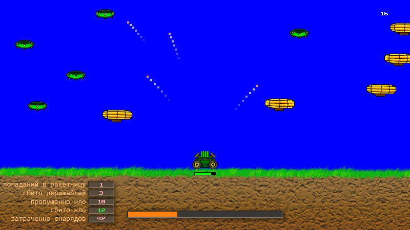 В отличие от изначальной игры зенитка у меня будет стационарной. Дирижабли двигаются со скоростью один пиксель за кадр, инопланетяне двигаются со скоростью 3 пикселя за кадр. На снаряд действует сила тяжести поэтому он летит по дуге.
