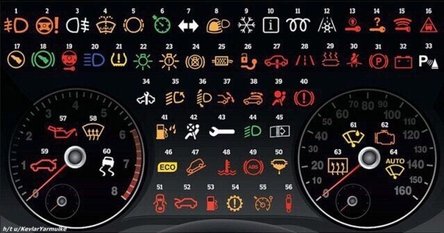 1. Противотуманные фары (передние). 2. Неисправность усилителя рулевого управления. 3. Противотуманные фары (задние). 4. Низкий уровень жидкости стеклоомывателя. 5. Износ тормозных колодок. 6. Значок включённого круиз-контроля. 7. Включены поворотные сигналы. 8. Датчик дождя и света. 9. Зимний режим. 10. Индикатор информационного сообщения. 11. Индикация работы свечи накаливания. 12. Мороз. 13. Индикация обнаружения бесконтактного ключа. 14. Ключ не обнаружен. 15. Батарея ключа нуждается в замене. 16. Опасное сокращение дистанции. 17. Нажмите педаль сцепления. 18. Нажмите тормозную педаль. 19. Блокировка рулевой колонки. 20. Дальний свет. 21. Низкое давление в шинах. 22. Индикатор включения наружного освещения. 23. Неисправность наружного освещения. 24. Не работает стоп-сигнал. 25. Предупреждение сажевого фильтра. 26. Предупреждение прицепного устройства. 27. Предупреждение пневматической подвески. 28. Смена полосы движения. 29. Перегрев катализатора. 30. Н