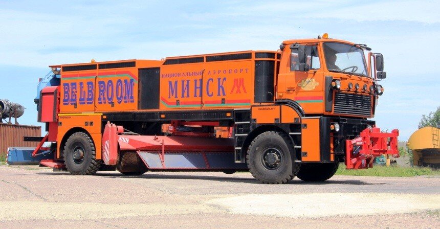 Сегодня я хочу показать вам один очень необычный грузовик, созданный на не менее необычном шасси МЗКТ. Он называется BELBROOM, а автором этого творения стала белорусская компания "Белстатс". Знакомьтесь, этого мастодонта зовут ББ-6000-ПБА. Возможно, вы уже догадались, что перед нами аэродромная снегоуборочная машина. В её основе - крайне необычное шасси МЗКТ с ломаной портальной рамой. Это значит, что в центральной части лонжероны рамы поднимаются, чтобы освободить место для уборочной щетки шириной 4 метра. Еще одной интересной особенностью шасси являются два ведущих моста, каждый из которых может поворачиваться независимо друг от друга. Такое решение не только обеспечивает необходимую тягу, но и отличную маневренность. Что, согласитесь, очень важно для такого длинного транспортного средства. Пока мы не двинулись дальше, предлагаю посмотреть на него в действии в официальном видеоролике с сайта производителя: Впечатляет, не правда ли? Взлетно-посадочные полосы, а также подъездные дорог