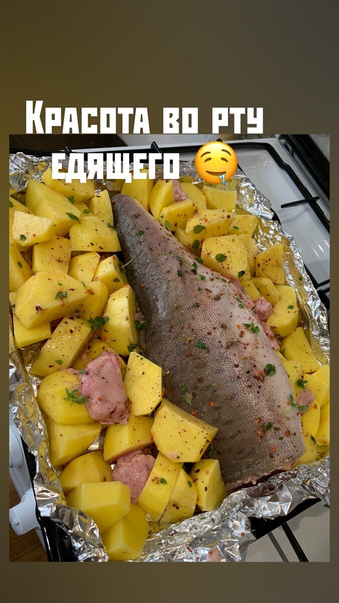 Добрый день, дорогой друг. Сегодня я хочу вам поведать , как приготовить ВКУСНУЮ рыбку быстро и без особых заморочек. А начнём мы с того , что для моего блюда мне потребовалось прикупить на рынке замороженную горбушу. Прям целиковую , замороженную тушку я и принесла домой. Размораживать её не нужно , это очень сэкономит время . Но сил мне не занимать, поэтому самым острым ножом в доме , прям мороженую рыбу , мы потрошим!! Дело это не из легких , но я справилась. Отрезаем плавники , голову и вынимаем внутренности. Тяжеловато , но лёд внутри рыбы даст нам мягкость и сочность. После того , как наша рыбка разделана , выкладываем её на противень смазанный растительным маслом. К рыбе я выбрала на гарнир картошечку , поэтому её мы тоже выкладываем к рыбе , предварительно почистив и порезав на дольки . Не забываем посолить и поперчить наш полуфабрикат . Так же я добавила овощную приправу (сухую морковь, баклажан и чеснок) . Все хорошенько перемешиваем и ставим в духовку на средний огонь (200 ‘