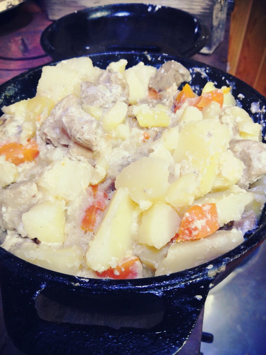 Эх, картошечка. Тушеная. В печке. С мясом. Моя любовь. Услада глаз моих и моего желудка. За поедание такой картошки можно и побороться с членами моей семьи, которые кушать ее любят, а готовить ленятся. Что же входит в рецепт этого столь любимого нами блюда. Все просто. Картофель, морковь, лук и чеснок со своего огорода. Мясо и сметана из магазина. Ну и чугунок с крышкой конечно. Хотя нет, еще печь с духовкой. Настоящая дровяная печь. Мясо режу небольшими кусочками, обжариваю немного в растительном масле вместе с луком, порезанным полукольцами, сразу в своем чугунке (его объем около 3 литров). Использую чаще всего свинину, но это не принципиально. Когда мясо "схватилось", закидываю к нему картошку, порезанную достаточно крупными кусками, морковь, порезанную толстыми колечками-круглешками. Заливаем все это водичкой, смешанной с несколькими ложками сметаны (количество сметаны по настроению, а воды - чтоб картошку почти покрывала). Можно добавить кусочек сливочного масла. Можно положи