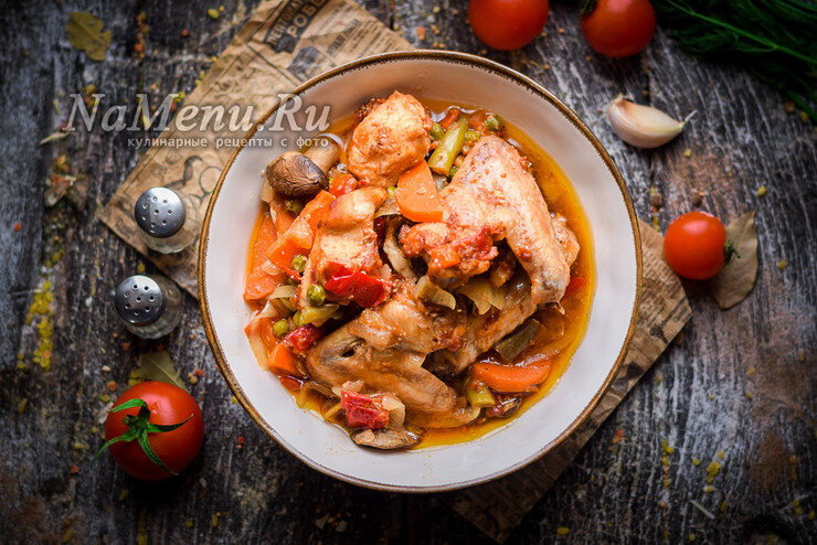 Ингредиенты: 💦Курицу сполоснуть. Филе нарезать крупными кусочками. Сложить курицу в глубокую миску. Всыпать к ней сухой чеснок 🥣Добавить аджику или томатный соус, соевый соус, горчицу, соль и перец по вкусу. Перемешать, оставить курицу на час промариноваться 🧅Очистить морковь и лук, сполоснуть. Лук нарезать полукольцами, морковь брусочками. Сладкий перец очистить. Нарезать соломкой 🌻Смазать жаропрочную форму растительным маслом, переложить все овощи в форму, по желанию добавить грибы, нарезанные пластинами 🌽Добавить также немного замороженных овощей 🔥Переложить на овощи курицу и влить соус, в котором курица мариновалась. Прогреть духовку до 180 градусов, переставить емкость и запекать 40-45 минут https://namenu.ru/10539/Kurica_v_duhovke_s_ovowami/