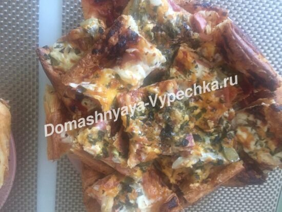 Пицца из слоеного бездрожжевого теста с колбасой и сыром