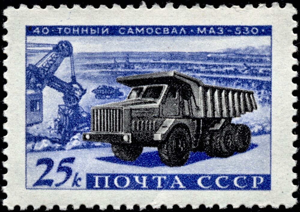 Первая советская серия "автомобильных" почтовых марок В 1960 году почта СССР выпустила серию из 4 марок "Советское автомобилестроение". Это был первый выпуск, целиком посвящённый автомобильной теме, до этого автомобили попадались лишь на отдельных марках. Советский автопром представили 2 легковых автомобиля, автобус и грузовик. На марке номиналом 25 копеек - карьерный самосвал МАЗ-530 грузоподъёмностью 40 тонн, который как раз с 1960 года начал серийно выпускаться на Белорусском автозаводе. Марка в 40 копеек посвящена одному из самых известных советских автомобилей - "Волге" ГАЗ-21. В 1960 году выпускалось уже второе поколение этой модели, отличавшееся новой решёткой радиатора, прозванной "акульей пастью". "Москвич-407", пришедший на смену 402-й модели, выпускался на МЗМА с 1958 по 1963 год. Он удостоился чести попасть на марку номиналом 60 копеек. Машина изображена ещё со старым вариантом оформления радиаторной решётки, с 1960 года внешний вид "Москвича" несколько изменится. И нако