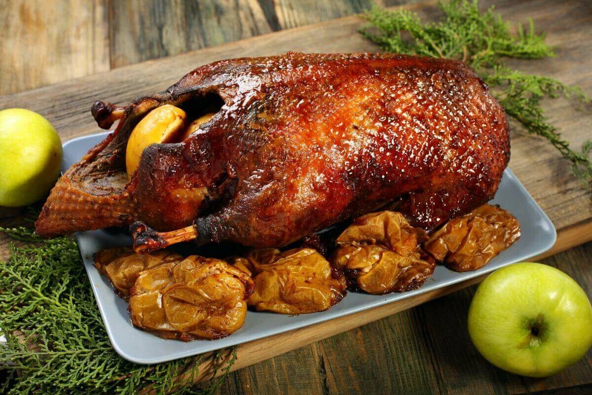 Не смотря на всю легкость его приготовления, это отличнейшее блюдо достойно займет почетное место на вашем столе, ведь сегодня мы приготовим на ужин вкуснейшую утку в пиве с яблоками. Для начала тщательно промываем утку под холодной водой и даем ей обсохнуть. Теперь хорошенько натираем ее со всех сторон и внутри солью и специями на ваш вкус. Яблоки и апельсины моем под холодной водой. Удаляем из яблок сердцевину и нарезаем их на дольки. Теперь фаршируем нашу утку апельсинами вперемешку с яблоками, оставшиеся яблоки выкладываем на дно утятницы. На яблоки кладем утку спиной вверх и заливаем все пивом так, чтобы оно доходило до краев утятницы. Закрываем утятницу крышкой и ставим в разогретую до 200 градусов духовку, запекаем пол часа. Затем снимаем крышку и готовим еще минут 7, чтобы спинка зарумянилась, затем переворачиваем и еще 7 минут запекаем брюшко. Готовую утку украшаем фруктами и подаем к столу Приятного аппетита! Подписывайтесь на канал, ставьте лайки, делитесь рецептами с друзь