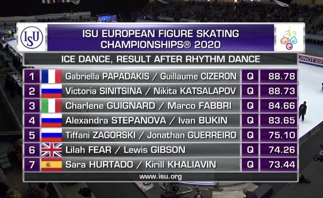 Второй день соревнований в рамках чемпионата Европы по фигурному катанию 2020 года включает в себя две дисциплины: ритм танец танцевальных пар и произвольная программа мужчин. Несколько минут назад завершили свои выступления танцевальные пары. Итоговые результаты после ритм танца выглядят следующим образом: Тиффани Загорски и Джонатан Гуррейро откатали свой ритм танец не на максимум. Однако серьезных ошибок им удалось избежать, это главное. Соглашусь с Ильей Авербухом, который оценил катание Джонатана сегодня довольно скованным. Тиффани была хороша, уж очень заражает всегда её широчайшая и замечательная улыбка. Молодцы, ребята, желаем удачи в субботу! Александра Степанова и Иван Букин заметно прибавляют. На мой взгляд, ребята откатали отлично, пусть и с небольшими помарками. Саша немного укоротила юбку и сделала хвост. Ничего уже не должно было помешать ребятам получить шикарные оценки. Однако судьи так не думают. Урезаны уровни практически всех элементов, а выше наших красавцев распо