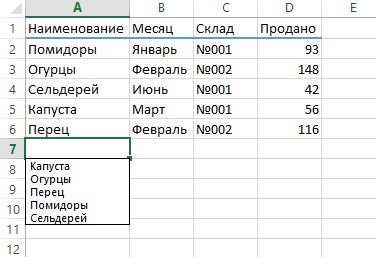 Один щелчок правой кнопкой мыши по пустой ячейке под столбцом с данными, команда контекстного меню Выбрать из раскрывающегося списка (Pick from drop-down list) или нажать сочетание клавиш Alt+стрелка вниз. Появится отсортированный список уникальных ранее введенных значений:
