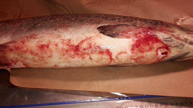 Речь пойдет о любимой многими гурманами семге или атлантическом лососе. В народе бытует мнение что семга (атлантический лосось) выращенная в садках не такая как дикая, и кормят ее неизвестно чем, и т.д. и т.п. Гурманам конечно виднее, но дело не в этом. Так вот товарищи какая проблема с дикой семгой. В реки Норвегии, Ирландии и России возвращаются больные лососи. Рыба имеет язвы, кровоподтеки и совсем неприглядный вид. Западные ученые ломают голову над этим заболеванием, наши пока определили ее как некоторую форму некроза, но окончательной ясности нет. Проблема обозначилась очень серьезная, поскольку на рыбоводных заводах не хватает здоровых производителей для воспроизводства, в частности такая ситуация сложилась на реке Умба. На самом деле ситуация с диким лососем и без этого критическая, поскольку уловы катастрофически сократились и соответственно уменьшился генофонд популяции. А что на Западе? Они отправили мертвую рыбу в норвежский ветеринарный институт-орган, которому п