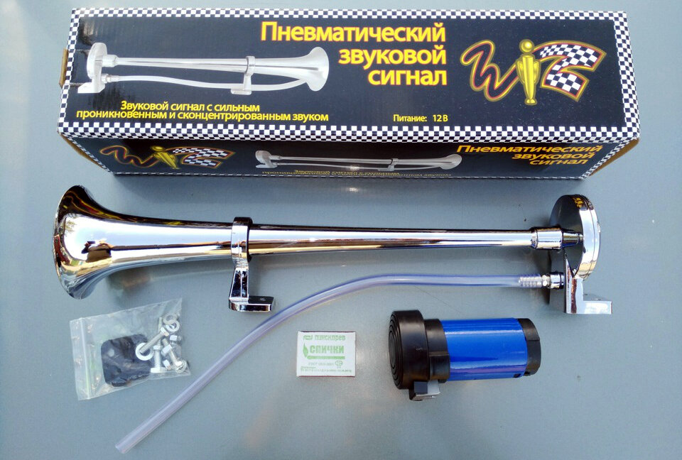 Всем привет! Сигнал по громче я ставил ещё на свою восьмёрку. Тогда комплект стоил 700 рублей. Звук сигнала был похож на паровозный. Восьмёрку я продал вместе с сигналом. Сейчас я езжу на семёрке, в которую я тоже поставил воздушный сигнал. Только обошёлся он мне дешевле нового. Летом я приехал к своему другу, у которого во дворе лежала дудка от сигнала. Он мне сказал, что она не работает и разрешил мне её забрать себе. Я приехал домой, налил в таз тёплой воды и начал разбирать дудку. Промыв её изнутри вместе с мембранами, которые были абсолютно целыми, я собрал всё обратно. Набрав по больше воздуха в свои лёгкие, я попробовал её продуть. И тут я услышал знакомый звук рабочего сигнала. Ну что думаю, надо покупать компрессор. Поехал в автомагазин за компрессором. Тогда он стоил 350 рублей. По приезду домой, я принялся к делу. 1. Первое что мы делаем, это снимаем решётку радиатора. 2. Снимаем кронштейн с родными рожковыми сигналами, что находятся под капотом. 3. Дудку я прикручивал к