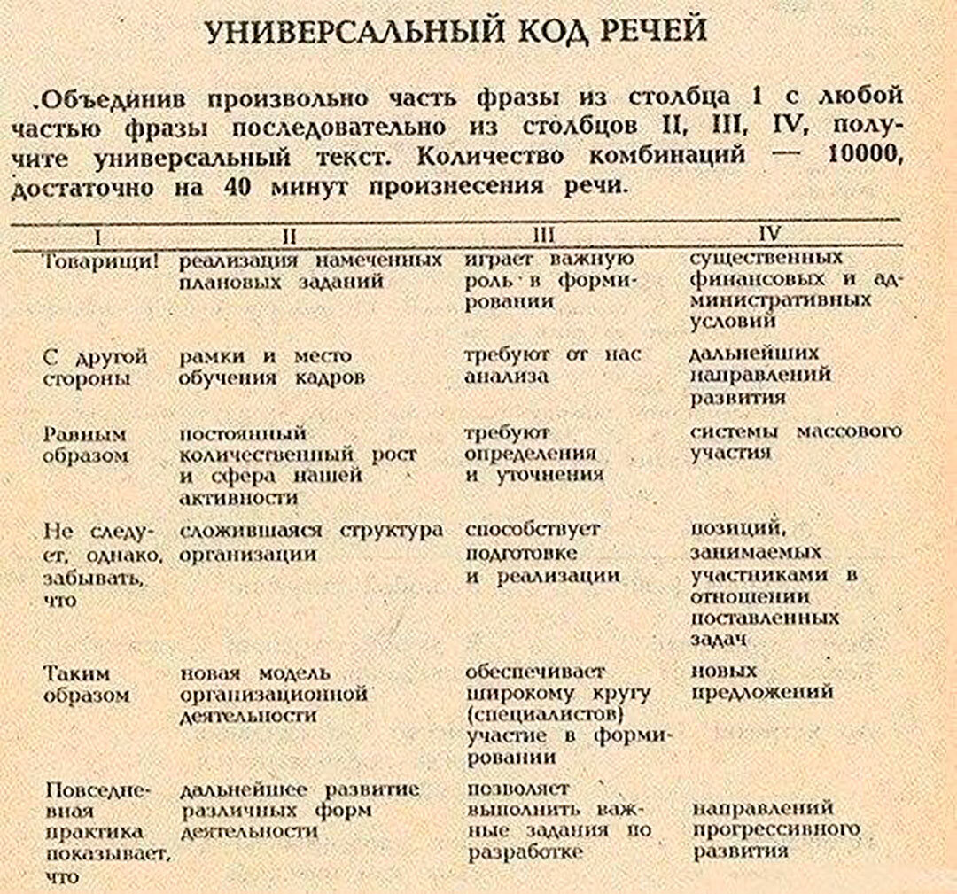 Данный универсальный код был написан в 1956 году и предназначался для использования "ленивыми" политиками. С помощью этой таблицы, содержащей 10000 комбинаций предложений, вы можете вещать минимум 40 минут без остановки. Речевой код - это исторически сложившаяся, социально сконструированная система терминов, значений, предпосылок и правил, относящихся к коммуникативному поведению.Также речевой код можно определить как набор правил, определяющих, "что говорить и как говорить в определённом контексте". Существует два аспекта речевого кода, необходимые для понимания его применения в теории: Вот такая ленивая политика бывает с трибун!