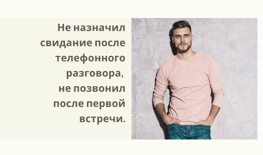 Такое может случиться много раз подряд. Можно подумать: «Боже, со мной что то не так… Почему они отказываются от меня? Почему я им не интересна?» Может даже пострадать самооценка. Я слышала от многих женщин и склонна была к таким реакциям сама. НО! Теперь я понимаю. Во-первых. Вы никогда не узнаете истинную причину. Да и оно вам надо? Во вторых. Он может не перезвонить, потому что у него другая цель отношений, скажем, секс на пару раз. Он испугался, понял, что вы ему не по плечу. Вот и всё. С вами всё в порядке. Нечем грузиться. А тем более, раз правды не узнать, для вас самой лучше остаться уверенной в том, что вы ему не по плечу, чем в том, что с вами что то не так. Мужчина, которому женщина по-настоящему интересна ничего не испугается, перезвонит, придёт. Всё остальное пыль, не стоящая нашего внимания!