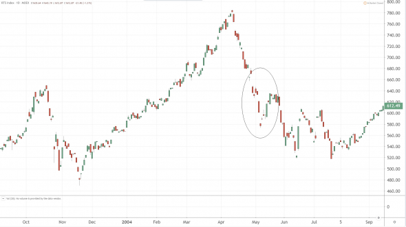 В конце 2003 — начале 2004 годов, после дела Юкоса, на рынке продолжался устойчивый тренд, Андрей уверенно, каждый месяц, показывал двузначную доходность и мы с дядей сначала увеличили сумму до 1 млн., а в скором времени и до 2 млн. С учетом прибыли за пол года, сумма активов была, в районе, 2,5 млн. руб. После здоровой коррекции в конце апреля, Андрей стал активно подбирать свои любимые РАО ЕЭС и Мосэнерго, используя плечи уже на новые лимиты, но после очередной новости по Юкосу 29 апреля, рынок открылся гэпом вниз на 5%.