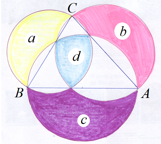 Решим задачу. Дан остроугольный треугольник, площадь которого равна S. На каждой его стороне, как на диаметре, построили окружность. На рисунке буквами a, b, c, d обозначены площади криволинейных треугольников. Докажите, что a + b + c – d = 2S. Решение будет опубликовано на сайте www.shevkin.ru, а здесь мы разместим ссылку на него. Предполагается напомнить задачу про луночки Гиппократа и показать, что доказываемое равенство выполняется в прямоугольном треугольнике, в остроугольном (наша задача), в тупоугольном. А вот и ссылка. 25.01.2020. Красивые задачи по геометрии. Площади. "Луночки" Гиппократа, равенство 2S = a + b + c - d для площади S треугольника и площадей криволинейных фигур a, b, c, d.