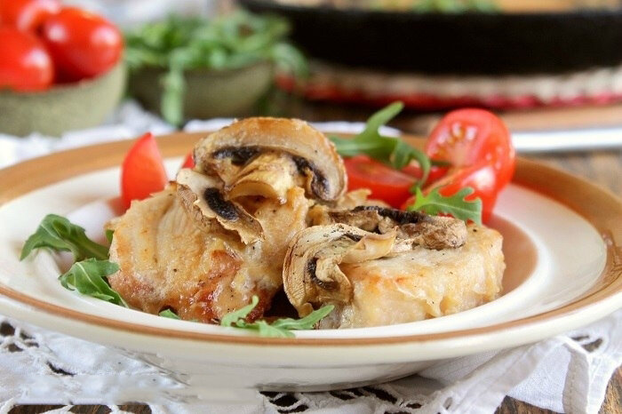 Нарежьте панчетту или бекон брусочком и добавьте в курицу. Когда курица подрумянится, добавьте пару зубчиков чеснока, лавровый лист, крупно нарезанные грибы.