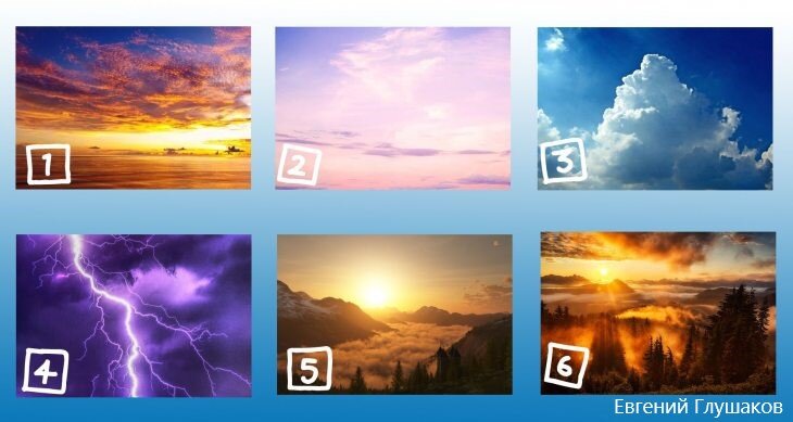 Приветствую вас дорогие читатели!!!😜😜😜😜😜 Вы когда-нибудь останавливались, чтобы посмотреть на небо? Закаты и восходы всегда способны запечатлеть глаза и сердца, но иногда небо выглядит великолепно, даже если оно облачное или серое. Сегодня мы проведем вас через испытание, которое принесет из глубин вашей души нечто, чего вы, возможно, не знали, что у вас есть: мы раскроем самые скрытые стороны вашей личности. Все, что вам нужно сделать, это посмотреть на изображение ниже. Какая из этих фотографий больше всего поражает ваше воображение? Выберите одну и узнайте, что это значит! НЕБО НОМЕР ОДИН Ваш персонаж чрезвычайно открытый и, прежде всего, понимающий. Вы типичный человек, который всегда может поставить себя на место другого человека и никогда не судить других поверхностно. Это очень редкие и ценные качества. Вы глубоко верите в силу сотрудничества: вы считаете, что нет ничего невозможного, если вы работаете вместе, чтобы достичь этого. Для таких, как вы, легко стать жертв